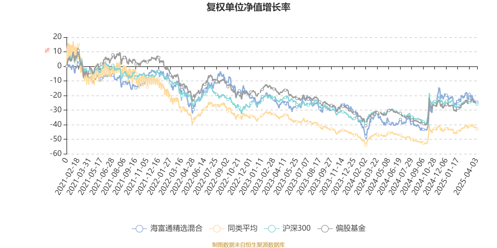 截至4月3日,海富通精选混合近三个月复权单位净值增长率为3.54%,位于同类可比基金171/256;近半年复权单位净值增长率为9.63%,位于同类可比基金31/256;近一年复权单位净值增长率为19.38%,位于同类可比基金32/256;近三年复权单位净值增长率为-6.24%,位于同类可比基金64/236。