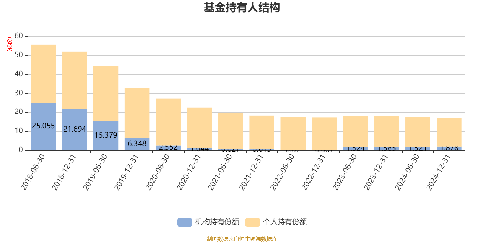 截至2024年12月31日,基金持有人共计5.55万户,合计持有17.07亿份。其中管理人员工持有16.05万份,占比0.01%,机构持有份额占比11.00%,个人投资者占比89.00%。