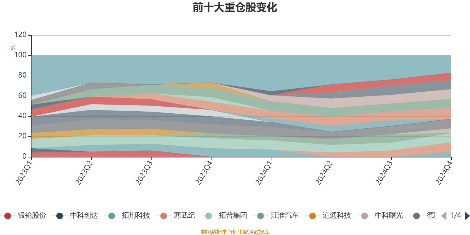 该基金持股集中度较高,近2年前十大重仓股集中度长期超过60%。截至2024年末,基金十大重仓股分别是赛力斯、北汽蓝谷、德赛西威、寒武纪、北方华创、拓普集团、中微公司、新易盛、拓荆科技、中科曙光。